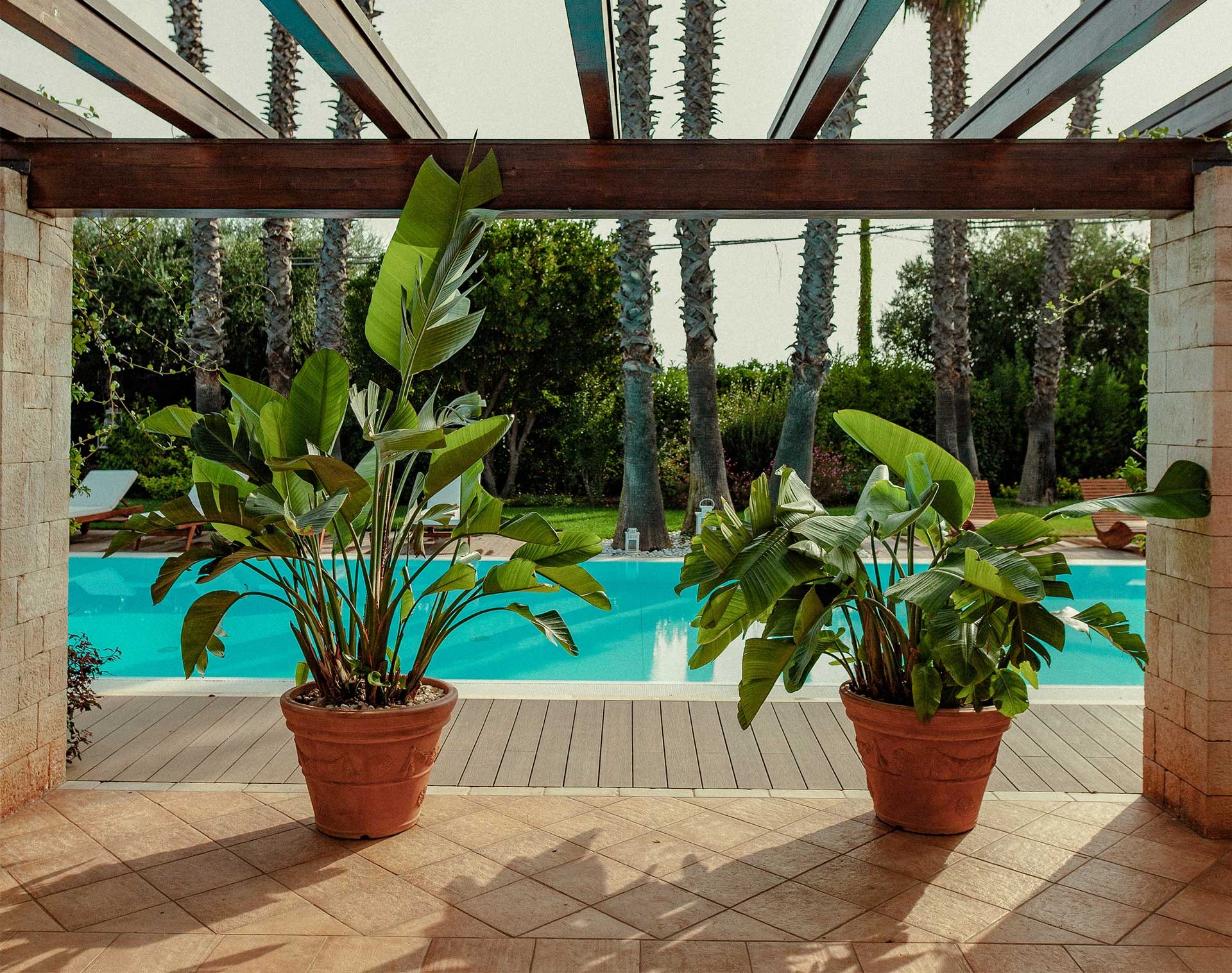 The concept follows three elements: nature, materials and design. Plants, palm trees and fruit trees are the elements that surround the villa. Wood is the material that is most present. The floors, the pergolas and the kitchen. Wood blends in harmony with stone while maintaining the rustic yet modern design of the spaces.